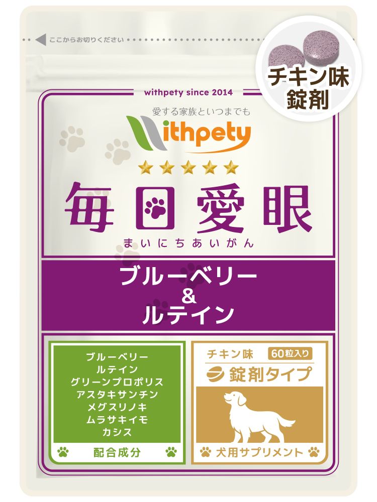 ウィズペティの「犬用・毎日愛眼 ブルーベリー&ルテイン」は7種類の成分を配合した犬の目の健康維持を目的としたサプリメントです。配合成分は(ブルーベリー〔ビルベリー〕ルテイン〔マリーゴールド〕・プロポリスエキス・アスタキサンチン・メグスリノキエキス・紫イモ・カシス抽出物となります。ウィズペティのペットサプリメントは国産品質、GMP、ペットフード安全法、残留農薬のポジティブリストに基づき、香料・着色料・保存料・化学調味料を使用せずに製造しています。 サプリメントは全犬種が食べやすい錠剤タイプ(直径8mmのチキン味錠剤/1袋60粒入り)です。