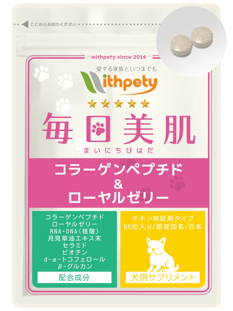 ウィズペティの「犬用・毎日美肌 コラーゲンペプチド&ローヤルゼリー」は皮膚の健康維持に必要な8種類の成分(コラーゲンペプチド・ローヤルゼリー・RNA・DNA・月見草油・セラミド・ビオチン・d-α-トコフェロール・βグルカン)を配合しています。安心安全の国産品質、GMP、ペットフード安全法、残留農薬のポジティブリストに基づき、香料・着色料・保存料・化学調味料を使用せずに製造しています。全犬種が食べやすい錠剤タイプです。(直径10mmのチキン味錠剤/1袋60粒入り)