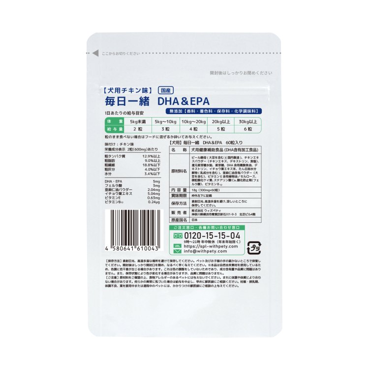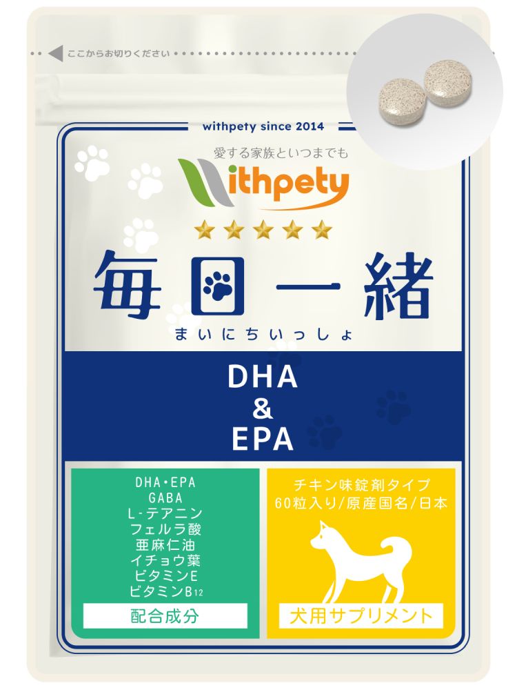 ウィズペティの「犬用・毎日一緒 DHA&EPA」は9種類の成分を配合したシニア犬・老犬の健康維持サプリメントです。配合成分はオメガ3のDHA・EPA・フェルラ酸・イチョウ葉エキス・GABA・L-テアニン・亜麻仁油・ビタミンE・ビタミンB12となります。 ウィズペティのペットサプリメントは国産品質、GMP、ペットフード安全法、残留農薬のポジティブリストに基づき、香料・着色料・保存料・化学調味料を使用せずに製造しています。全犬種が食べやすい錠剤タイプです。(直径10mmのチキン味錠剤/1袋60粒入り)