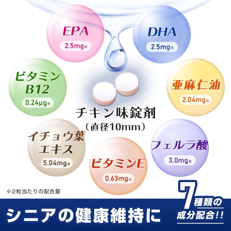 | 原材料名 | ビール酵母(大豆を含む)、チキンエキスパウダー(デキストリン、チキンエキス)(鶏肉を含む)、還元麦芽糖水飴、麦芽糖、DHA含有精製魚油、デキストリン、大麦乳酸発酵液ギャバ末、イチョウ葉エキス末、たん白加水分解物(乳成分を含む)、亜麻仁油含有パウダー(大豆を含む)、ビタミンE含有植物油/セルロース、微粒酸化ケイ素、ステアリン酸Ca、L-テアニン、酸化防止剤(フェルラ酸)ビタミンB12 |