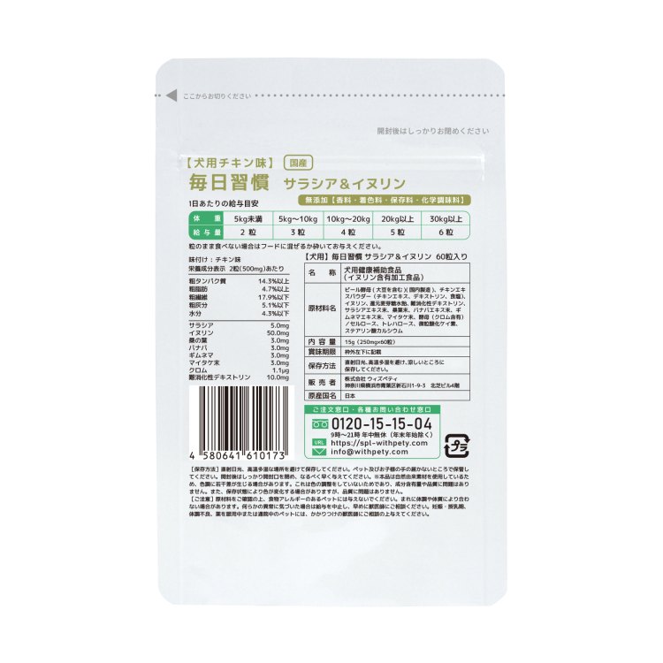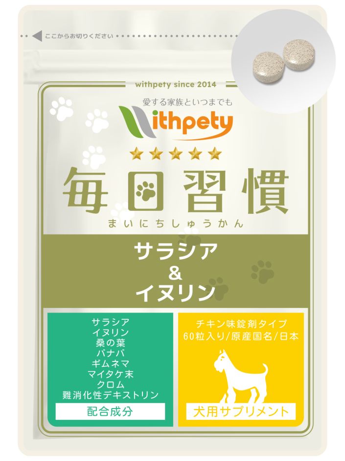 ウィズペティの「犬用・毎日習慣 サラシア&イヌリン」は肥満で負担のかかる血糖値・体重管理の健康維持に必要な8種類(サラシア・イヌリン・バナバ・クロム・マイタケ末・ギムネマ・桑の葉・難消化デキストリン)を配合しています。安心安全の国産品質、GMP、ペットフード安全法、残留農薬のポジティブリストに基づき、香料・着色料・保存料・化学調味料を使用せずに製造しています。全犬種が食べやすい錠剤タイプです。(直径8mmのチキン味錠剤/1袋60粒入り)