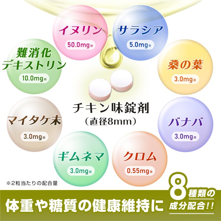 | 原材料名 | ビール酵母(大豆を含む)、チキンエキスパウダー(チキンエキス、デキストリン、食塩)、イヌリン、還元麦芽糖水飴、難消化性デキストリン、サラシアエキス末、桑葉末、バナバエキス末、ギムネマエキス末、マイタケ末、酵母(クロム含有)/セルロース、トレハロース、微粒酸化ケイ素、ステアリン酸カルシウム |