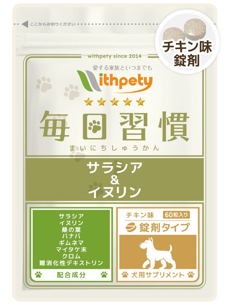 ウィズペティの「犬用・毎日習慣 サラシア&イヌリン」は肥満で負担のかかる血糖値・体重管理の健康維持に必要な8種類(サラシア・イヌリン・バナバ・クロム・マイタケ末・ギムネマ・桑の葉・難消化デキストリン)を配合しています。安心安全の国産品質、GMP、ペットフード安全法、残留農薬のポジティブリストに基づき、香料・着色料・保存料・化学調味料を使用せずに製造しています。全犬種が食べやすい錠剤タイプです。(直径8mmのチキン味錠剤/1袋60粒入り)