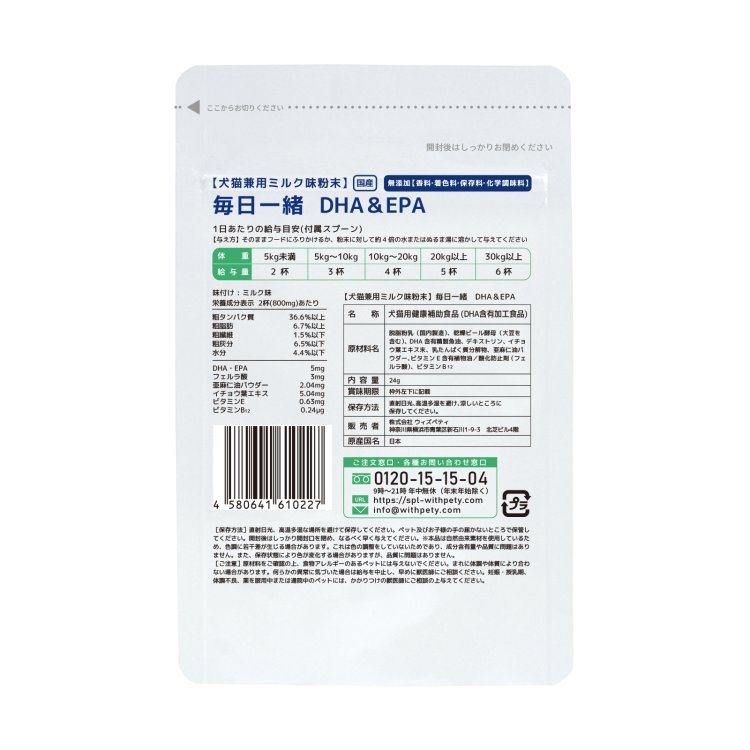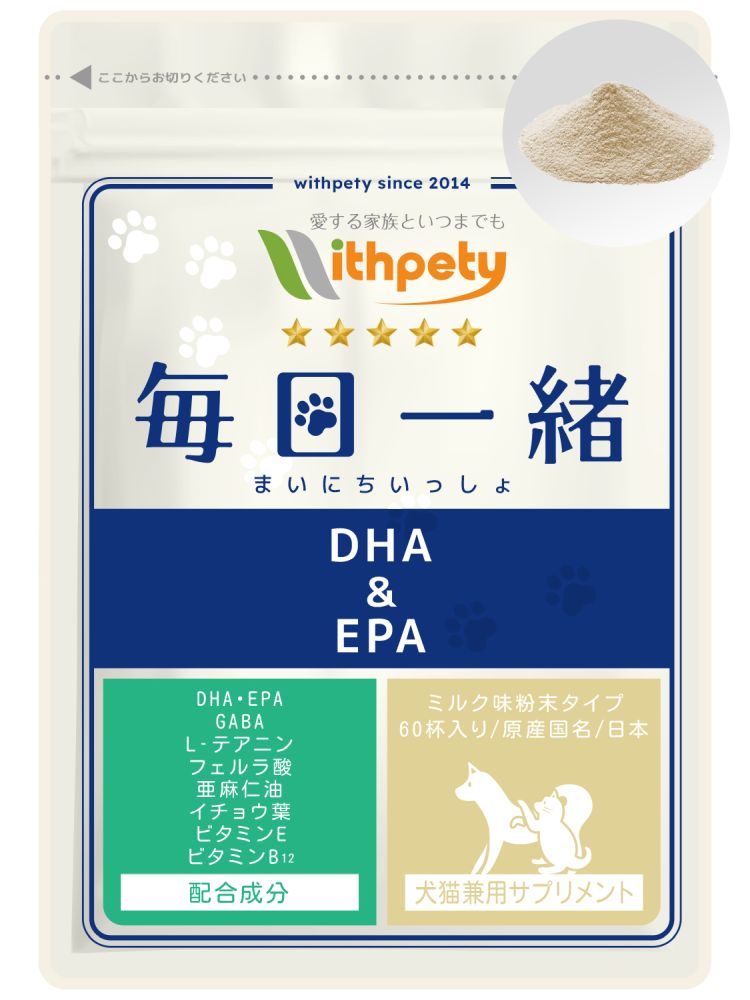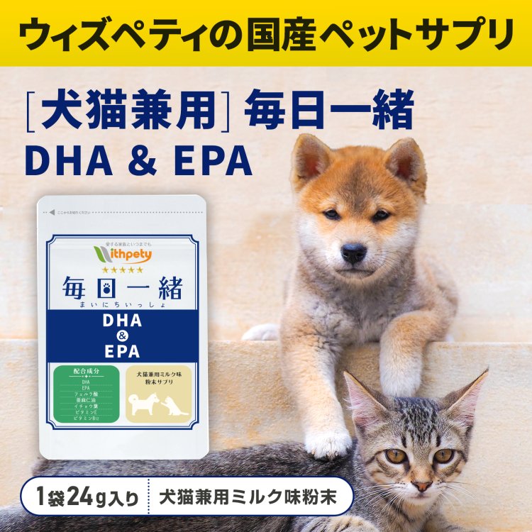 ウィズペティの「犬猫兼用・毎日一緒 DHA&EPA」は老犬・シニア犬・老猫・シニア猫の健康維持に必要な9種類の成分(DHA・EPA・フェルラ酸・イチョウ葉エキス・GABA・L-テアニン・亜麻仁油・ビタミンE・ビタミンB12)を配合した犬猫兼用粉末サプリメントです。安心安全の国産品質、GMP、ペットフード安全法、残留農薬のポジティブリストに基づき、香料・着色料・保存料・化学調味料を使用せずに製造しています。全犬種・全猫種が食べやすいミルク味粉末タイプです。(ミルク味粉末/1袋24g入り/付属スプーン60杯分)