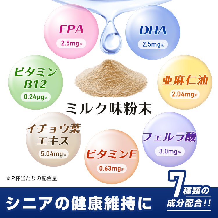 | 2杯あたりの配合量(付属スプーン) | DHA・EPA 5mg、フェルラ酸 3mg、亜麻仁油パウダー 2.04mg、イチョウ葉エキス 5.04mg、ビタミンE 0.63mg、ビタミンB12 0.24μg |