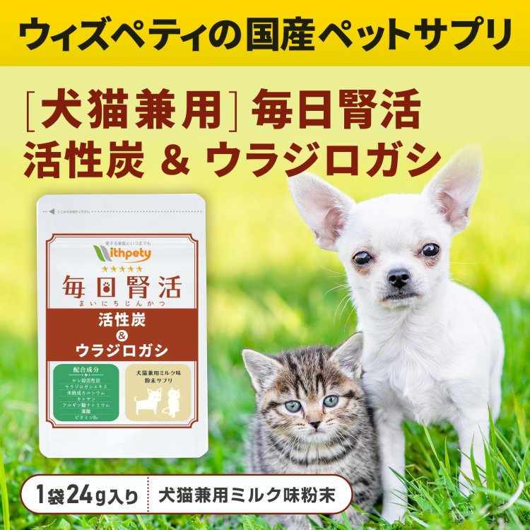 ウィズペティの「犬猫兼用・毎日腎活 活性炭&ウラジロガシ」は犬と猫の腎臓・泌尿器の健康維持に必要な7種類の成分(ヤシ殻活性炭・ウラジロガシ・未焼成カルシウム・キトサン・アルギン酸ナトリウム・葉酸 ビタミンB6)を配合した犬猫兼用粉末サプリメントです。安心安全の国産品質、GMP、ペットフード安全法、残留農薬のポジティブリストに基づき、香料・着色料・保存料・化学調味料を使用せずに製造しています。全犬種・全猫種が食べやすいミルク味粉末タイプです。(ミルク味粉末/1袋24g入り/付属スプーン60杯分)