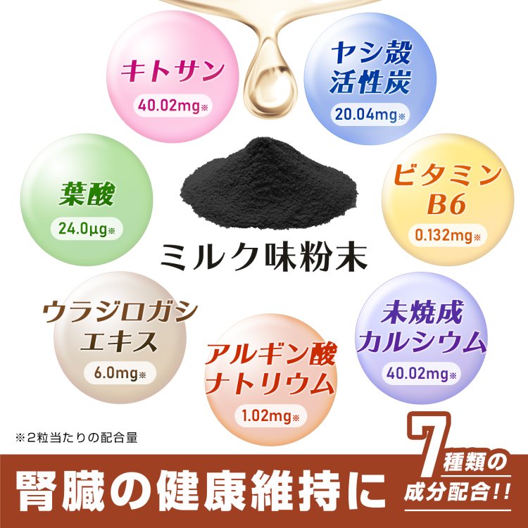 | 原材料名 | 脱脂粉乳(国内製造)、乾燥ビール酵母(大豆を含む)、ヤシ殻活性炭粉末、ウラジロガシエキス末、肝臓分解物(豚肉を含む)/キトサン(カニ由来)、貝カルシウム、糊料(アルギン酸Na)、ビタミンB6、葉酸 |