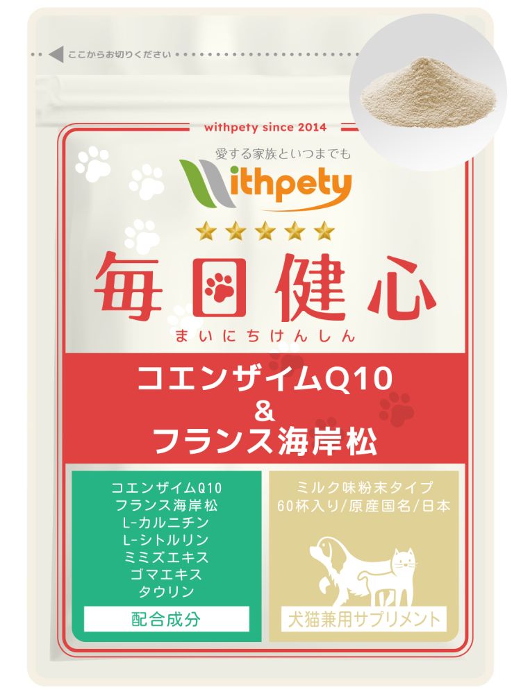 ウィズペティの「犬猫兼用・毎日健心 コエンザイムQ10&フランス海岸松」は犬と猫の心臓の健康維持に必要な7種類の成分(還元型コエンザイムQ10・フランス海岸松・L-シトルリン・L-カルニチン・ルンブルクス末・ゴマエキス・タウリン)を配合した犬猫兼用粉末サプリメントです。安心安全の国産品質、GMP、ペットフード安全法、残留農薬のポジティブリストに基づき、香料・着色料・保存料・化学調味料を使用せずに製造しています。全犬種・全猫種が食べやすいミルク味粉末タイプです。(ミルク味粉末/1袋24g入り/付属スプーン60杯分)