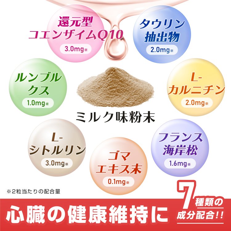| 原材料名 | 脱脂粉乳(国内製造)、乾燥ビール酵母(大豆を含む)、還元型コエンザイムQ10、L-シトルリン、L-カルニチンフマル酸塩、フランス海岸末樹皮エキス末、ルンブルクス末、ゴマ抽出物、タウリン抽出物 |