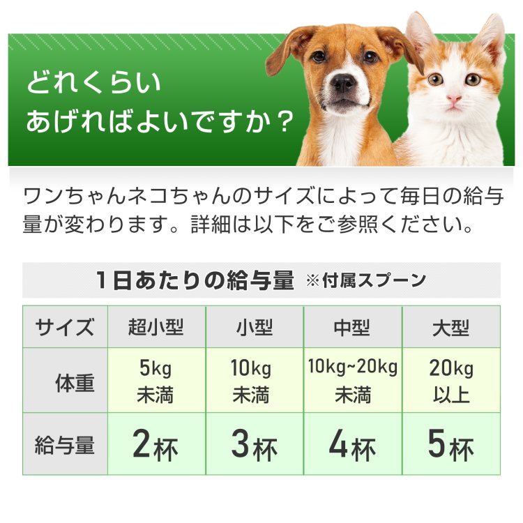 - ワンちゃん・ネコちゃんのサイズによって毎日の給与量が変わります。