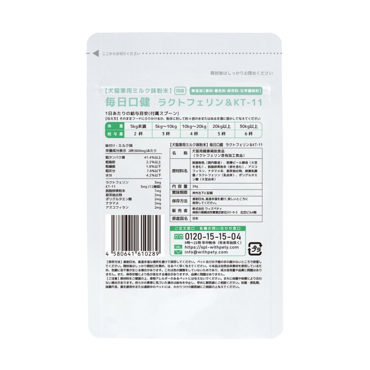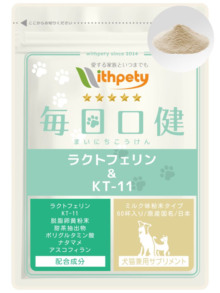 ウィズペティの「犬猫兼用・毎日口健 ラクトフェリン&KT-11」は犬と猫のお口の健康維持のために7種類の成分(ラクトフェリン・KT-11・卵黄粉末〔グロビゲン〕・甜茶抽出物・ポリグルタミン酸・ナタマメ・アスコフィラン)を配合した犬猫兼用粉末サプリメントです。 安心安全の国産品質、GMP、ペットフード安全法、残留農薬のポジティブリストに基づき、香料・着色料・保存料・化学調味料を使用せずに製造しています。全犬種・全猫種が食べやすいミルク味粉末タイプです。(ミルク味粉末/1袋24g入り/付属スプーン60杯分)