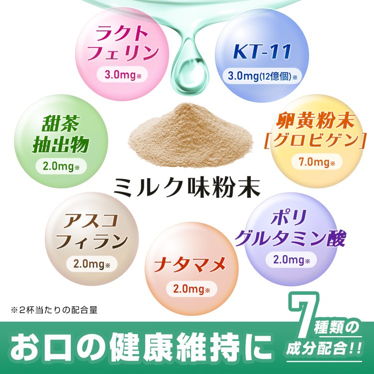 | 2杯あたりの配合量(付属スプーン) | ラクトフェリン(3mg)、KT-11(3mg/12億個)、卵黄粉末〔グロビゲン〕(7mg)、甜茶抽出物(2mg)、ポリグルタミン(2mg)、ナタマメ(2mg)、アスコフィラン(2mg) |