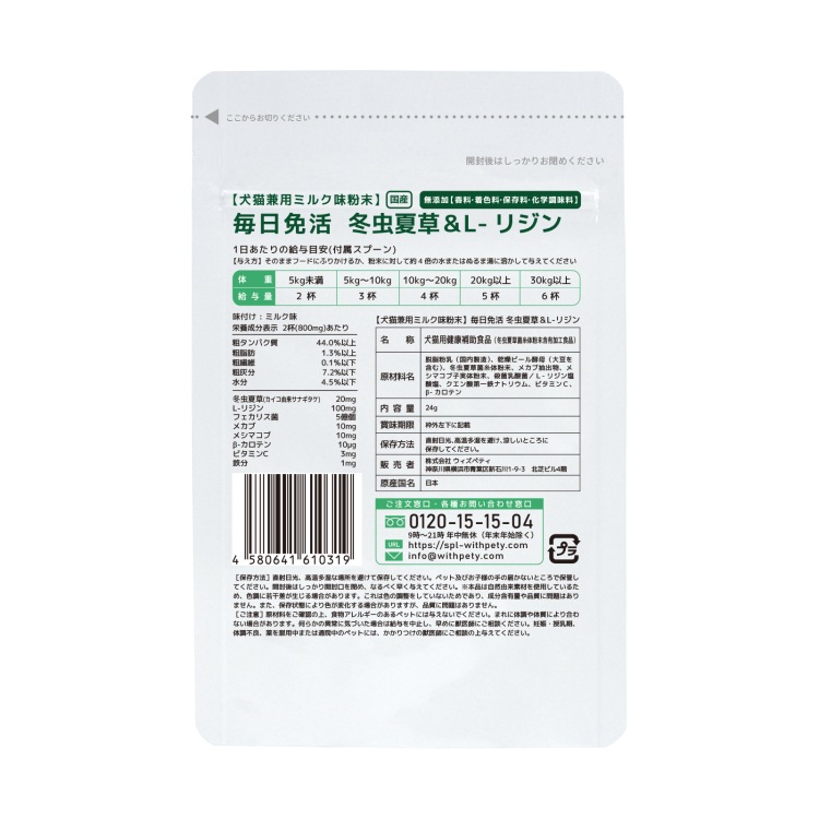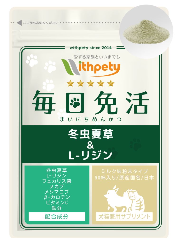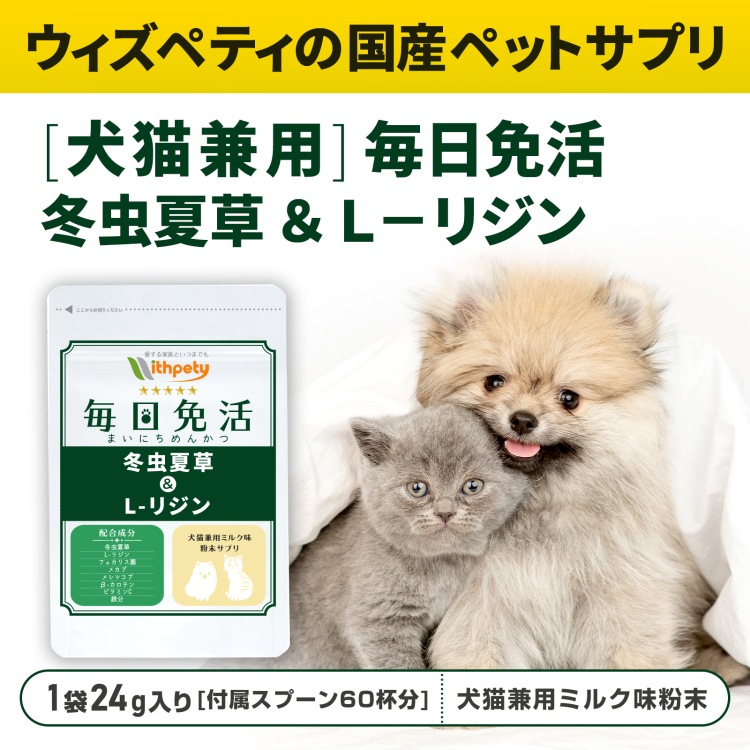 ウィズペティの「犬猫兼用・毎日免活 冬虫夏草&L-リジン」は愛犬・愛猫の健康維持の為に8種類の成分(冬虫夏草〔カイコ由来サナギタケ〕・L-リジン・フェカリス菌・メカブ・メシマコブ・β-カロテン・ビタミンC・鉄分)を配合しています。安心安全の国産品質、GMP、ペットフード安全法、残留農薬のポジティブリストに基づき、香料・着色料・保存料・化学調味料を使用せずに製造しています。全犬種・全猫種が食べやすいミルク味粉末タイプです。(ミルク味粉末/1袋24g入り/付属スプーン60杯分)