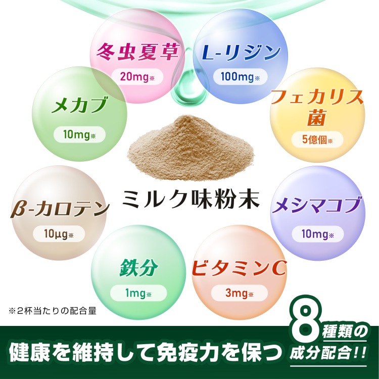 | 原材料名 | 脱脂粉乳(国内製造)、乾燥ビール酵母(大豆を含む)、冬虫夏草菌糸体粉末、メカブ抽出物、メシマコブ子実体粉末、殺菌乳酸菌/L-リジン塩酸塩、クエン酸第一鉄ナトリウム、ビタミンC、β- カロテン |