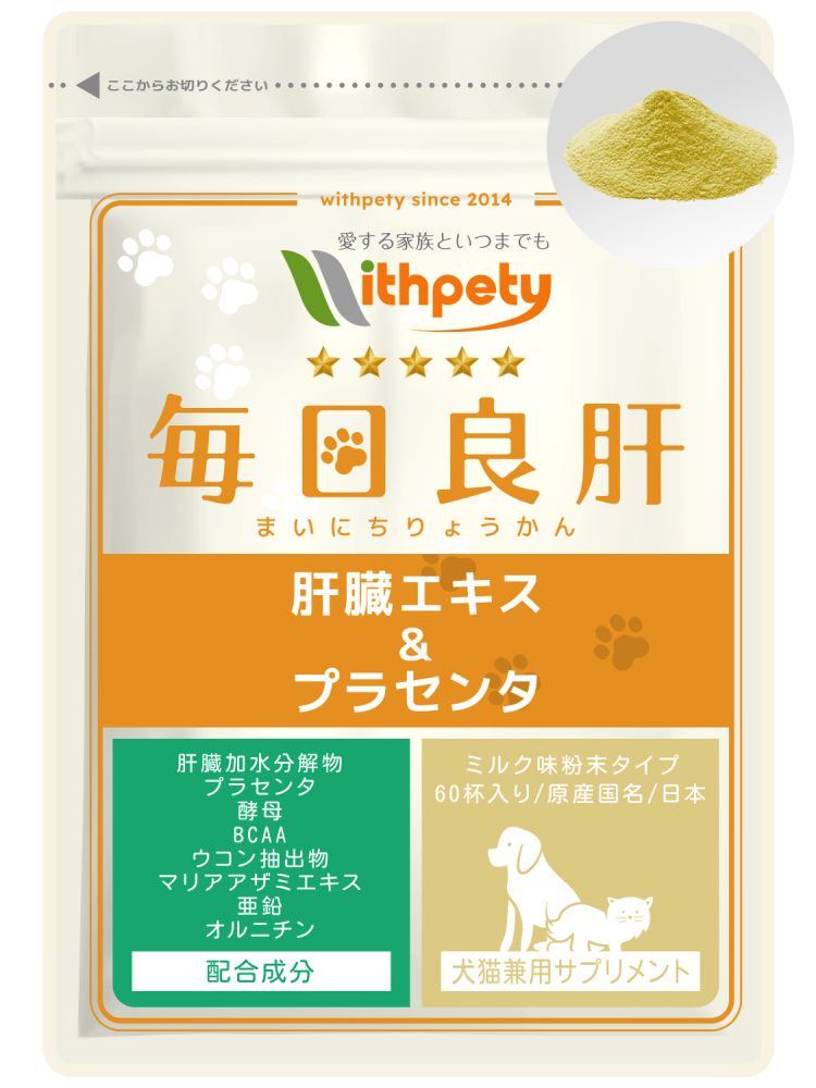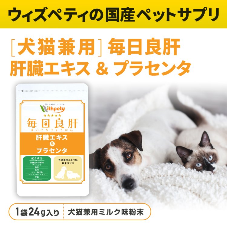 ウィズペティの「犬猫兼用・毎日良肝 肝臓エキス&プラセンタ」は犬と猫の肝臓の健康維持に必要な8種類の成分(肝臓加水分解物・プラセンタ・天然酵母・BCAA・ウコン・マリアアザミエキス・亜鉛・オルニチン)を配合した犬猫兼用粉末サプリメントです。安心安全の国産品質、GMP、ペットフード安全法、残留農薬のポジティブリストに基づき、香料・着色料・保存料・化学調味料を使用せずに製造しています。全犬種・全猫種が食べやすいミルク味粉末タイプです。(ミルク味粉末/1袋24g入り/付属スプーン60杯分)