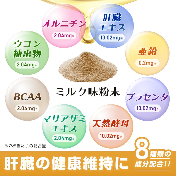 | 2杯あたりの配合量(付属スプーン) | 肝臓加水分解物10.02mg、天然酵母 10.02mg、プラセンタ 10.02mg、BCAA 2.04mg、ウコン抽出物 2.04mg、マリアアザミエキス 2.04mg、亜鉛 0.2mg、オルニチン 2.04mg |