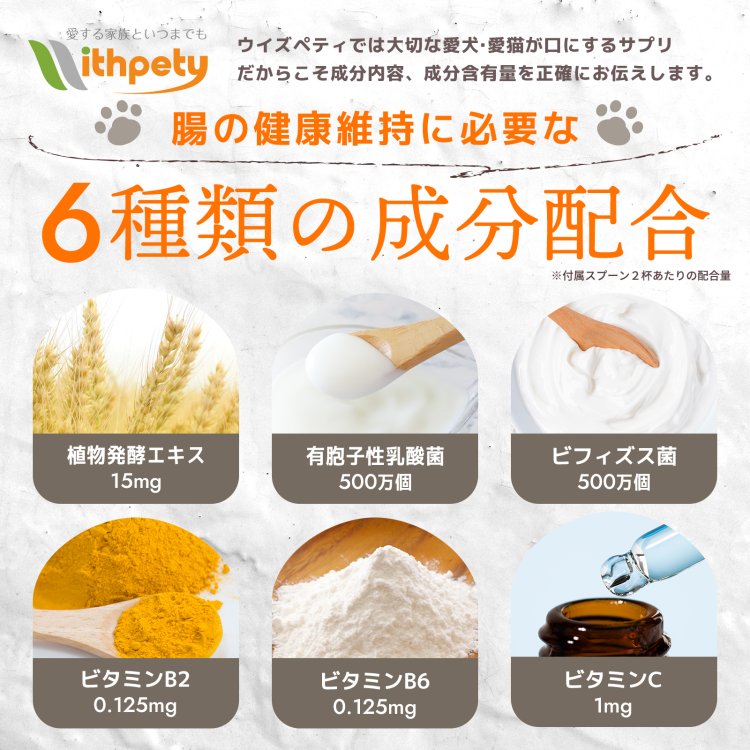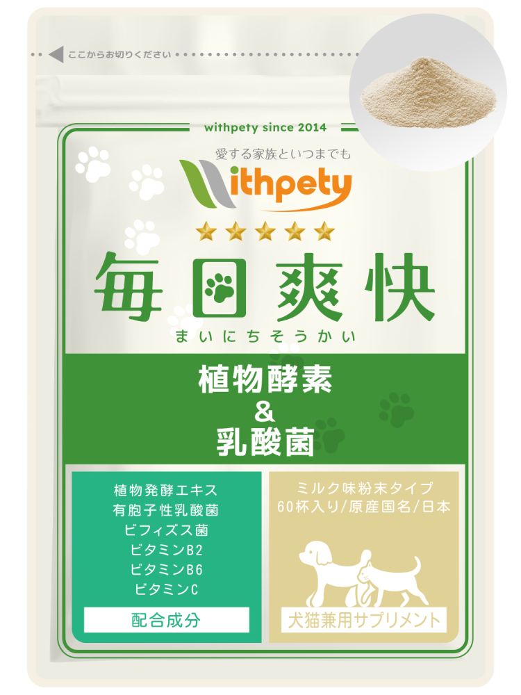 ウィズペティの「犬猫兼用・毎日爽快 植物酵素&乳酸菌」は犬と猫の腸(腸内環境)の健康維持のために6種類の成分(植物発酵エキス〔プロアテーゼ・アミラーゼ・リパーゼ・セルラーゼ・ラクターゼ〕・生きて腸まで届けることにこだわった「乳酸菌(有胞子性乳酸菌)」、さらに「ビフィズス菌」「ビタミンC」「ビタミンB2」「ビタミンB6」を配合しています。安心安全の国産品質、GMP、ペットフード安全法、残留農薬のポジティブリストに基づき、香料・着色料・保存料・化学調味料を使用せずに製造しています。全犬種・全猫種が食べやすいミルク味粉末タイプです。(ミルク味粉末/1袋24g入り/付属スプーン60杯分)