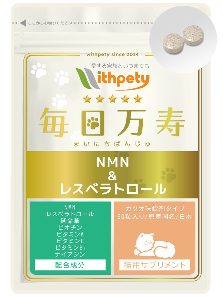 ウィズペティの「毎日万寿 NMN&レスベラトロール」は愛猫の長生きの健康維持の為に7種類の成分(NMN、レスベラトロール、延命草、ビオチン、ビタミンA、ビタミン E、ビタミン B 1、ビタミン B 3)を配合しています。NMNは純度99%の国産品を使用し相乗効果が期待できるレスベラトロール(リンゴンベリー由来)も配合しています。サプリの製造も国産品質、GMP、ペットフード安全法、残留農薬のポジティブリストに基づき、香料・着色料・保存料・化学調味料を使用せずに製造しています。全猫種が食べやすい錠剤タイプです。(直径8mmのカツオ味錠剤/1袋60粒入り)