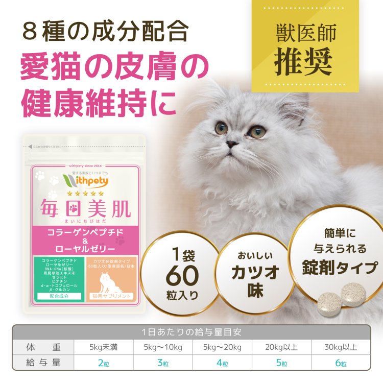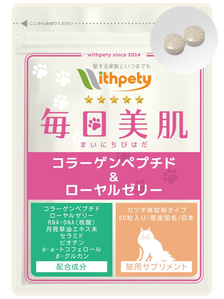 ウィズペティの「猫用・毎日美肌 コラーゲンペプチド&ローヤルゼリー」は皮膚の健康維持に必要な8種類の成分(コラーゲンペプチド・ローヤルゼリー・RNA・DNA・月見草油・セラミド・ビオチン・d-α-トコフェロール・βグルカン)を配合しています。安心安全の国産品質、GMP、ペットフード安全法、残留農薬のポジティブリストに基づき、香料・着色料・保存料・化学調味料を使用せずに製造しています。全猫種が食べやすい錠剤タイプです。(直径10mmのカツオ味錠剤/1袋60粒入り)