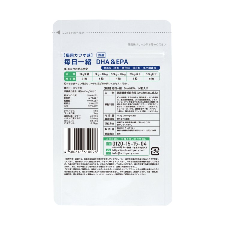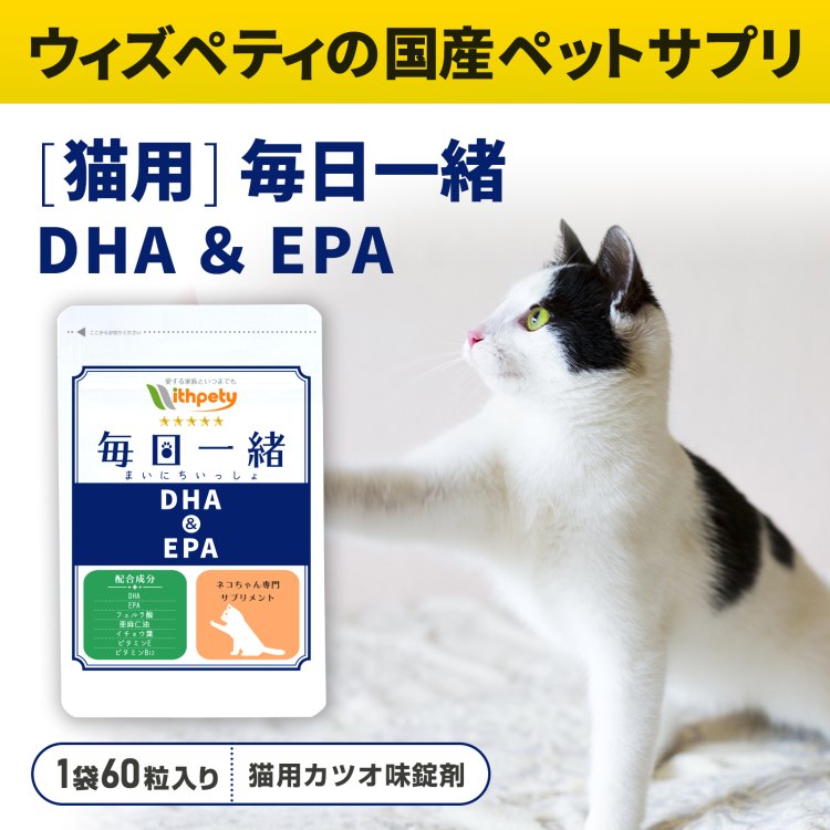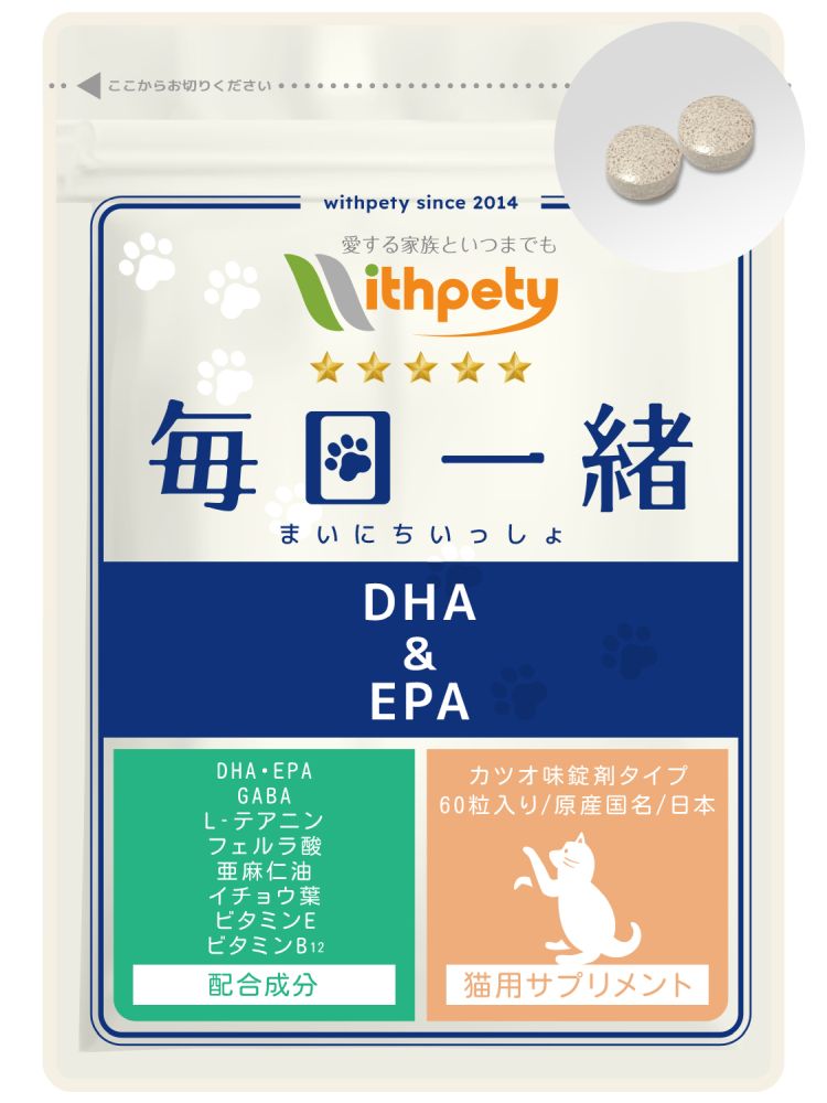 ウィズペティの「猫用・毎日一緒 DHA&EPA」はシニアケアに必要な9種類の成分(DHA・EPA・GABA・L-テアニン・フェルラ酸・亜麻仁油・イチョウ葉・ビタミンE・ビタミンB12)を配合しています。安心安全の国産品質、GMP、ペットフード安全法、残留農薬のポジティブリストに基づき、香料・着色料・保存料・化学調味料を使用せずに製造しています全猫種が食べやすい錠剤タイプです。(直径10mmのカツオ味錠剤/1袋60粒入り)