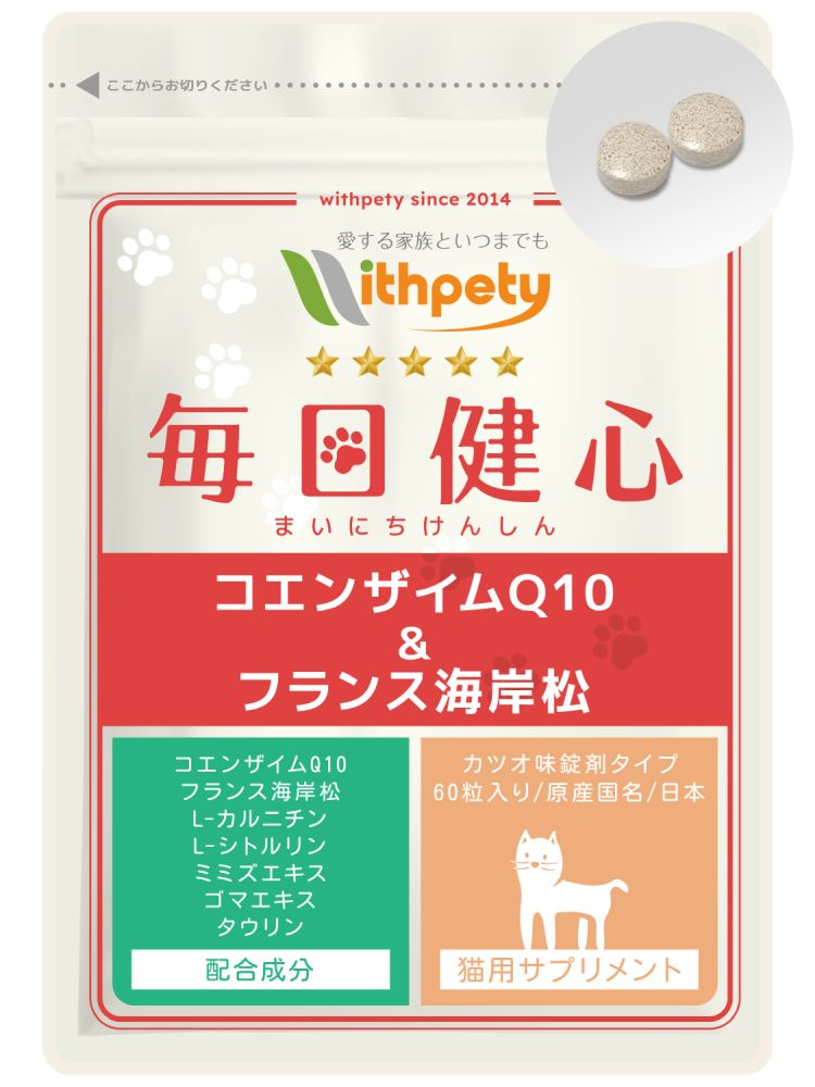 ウィズペティの「猫用・毎日健心 コエンザイムQ10&フランス海岸松」は心臓の健康維持に必要な7種類の成分(還元型コエンザイムQ10・フランス海岸松・L-シトルリン・L-カルニチン・ルンブルクス末・ゴマエキス・タウリン)を配合しています。安心安全の国産品質、GMP、ペットフード安全法、残留農薬のポジティブリストに基づき、香料・着色料・保存料・化学調味料を使用せずに製造しています。全猫種が食べやすい錠剤タイプです。(直径10mmのカツオ味錠剤/1袋60粒入り)