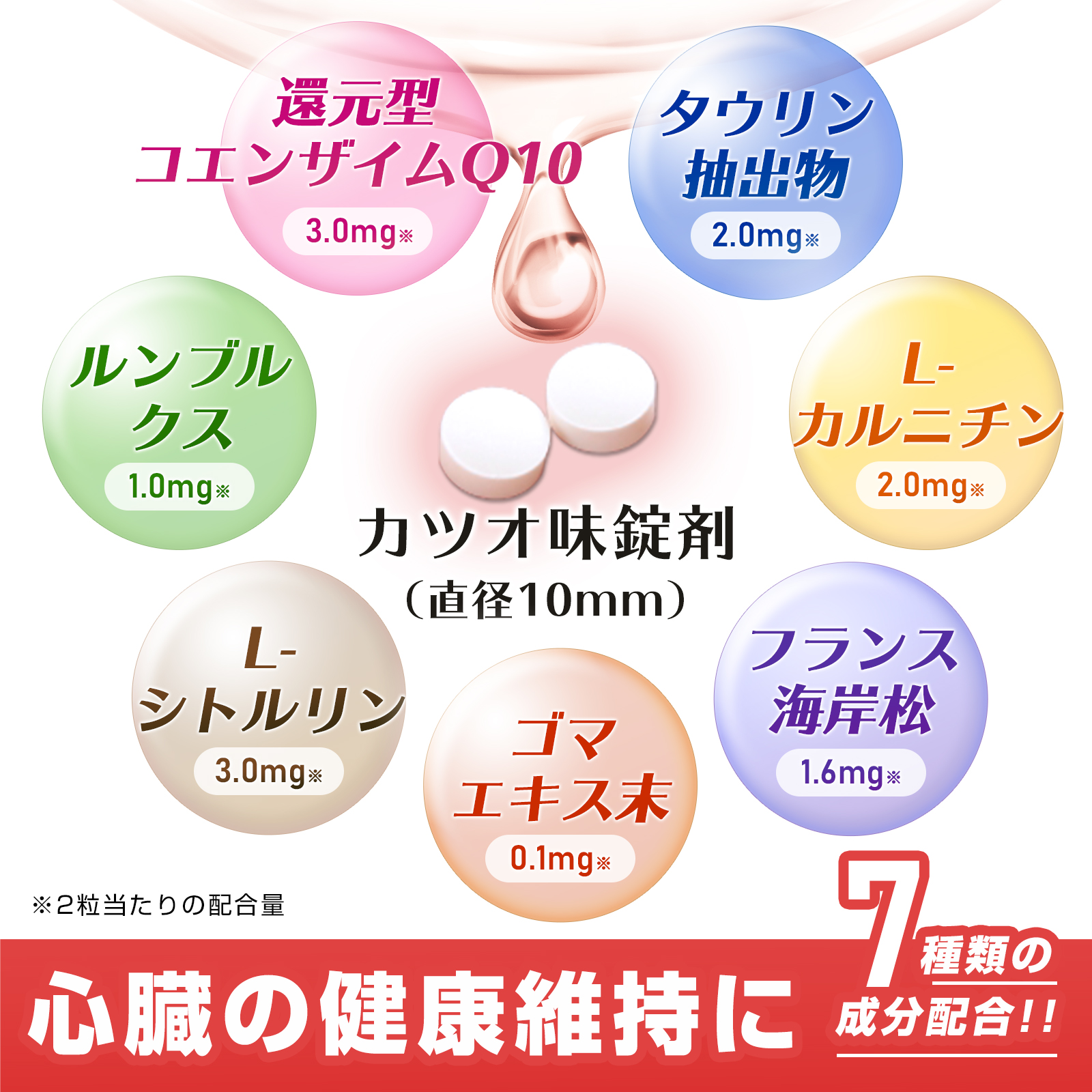 | 2粒あたりの配合量 | 還元型コエンザイムQ10 3.0mg、フランス海岸松 1.6mg、L-カルニチン 2.0mg、L-シトルリン 3.0mg、ルンブルクス 1.0mg《ミミズ乾燥粉末》、ゴマエキス 0.1mg、タウリン抽出物 2.0mg |
