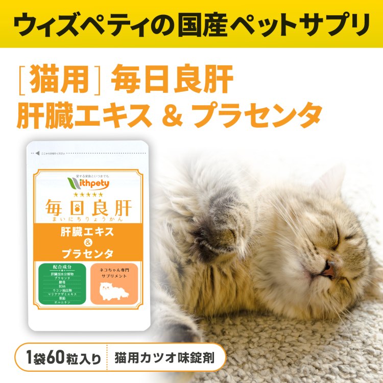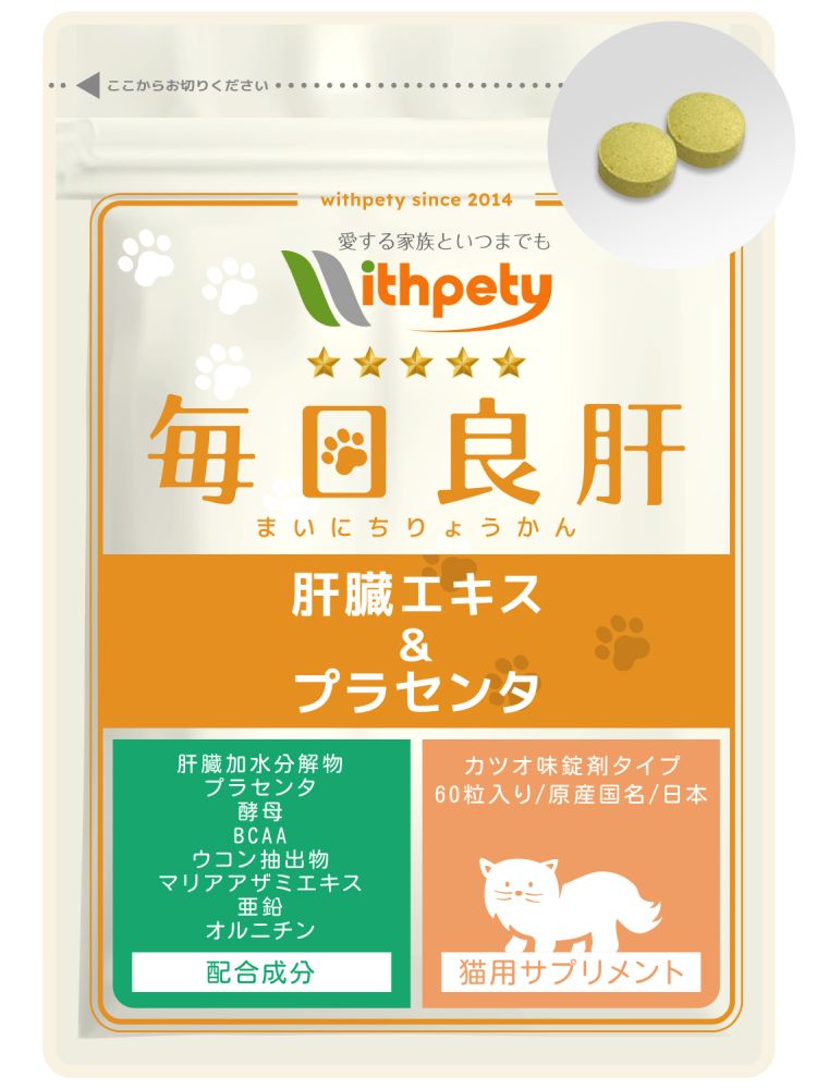 ウィズペティの「猫用・毎日良肝 肝臓エキス&プラセンタ」は肝臓の健康維持に必要な8種類の成分(肝臓加水分解物・プラセンタ・天然酵母・BCAA・ウコン・マリアアザミエキス・亜鉛・オルニチン)を配合しています。安心安全の国産品質、GMP、ペットフード安全法、残留農薬のポジティブリストに基づき、香料・着色料・保存料・化学調味料を使用せずに製造しています。全猫種が食べやすい錠剤タイプです。(直径10mmのカツオ味錠剤/1袋60粒入り)