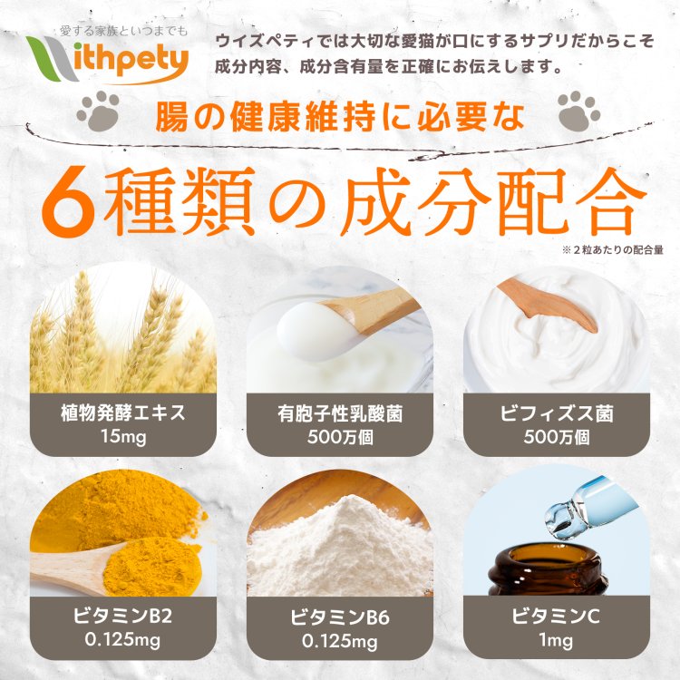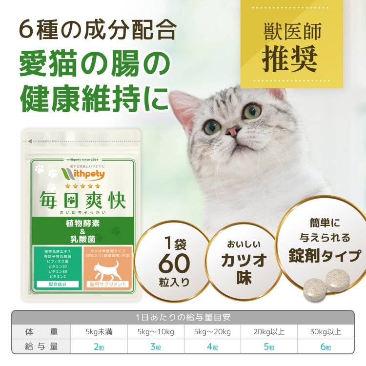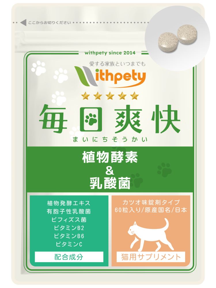 ウィズペティの「猫用・毎日爽快 植物酵素&乳酸菌」は5つの消化酵素の働きを持つ「植物酵素(植物発酵エキス プロテアーゼ・アミラーゼ・リパーゼ・セルラーゼ・ラクターゼ)」と、生きて腸まで届けることにこだわった「乳酸菌(有胞子性乳酸菌)」、さらに「ビフィズス菌」「ビタミンC」「ビタミンB2」「ビタミンB6」を一緒に摂れる猫用腸活サプリメントです。 ウィズペティのペットサプリメントは国産品質、GMP、ペットフード安全法、残留農薬のポジティブリストに基づき、香料・着色料・保存料・化学調味料を使用せずに製造しています。(直径8mmのカツオ味錠剤/1袋60粒入り)