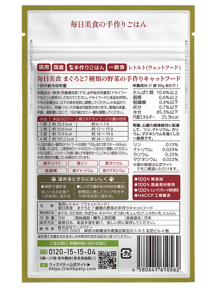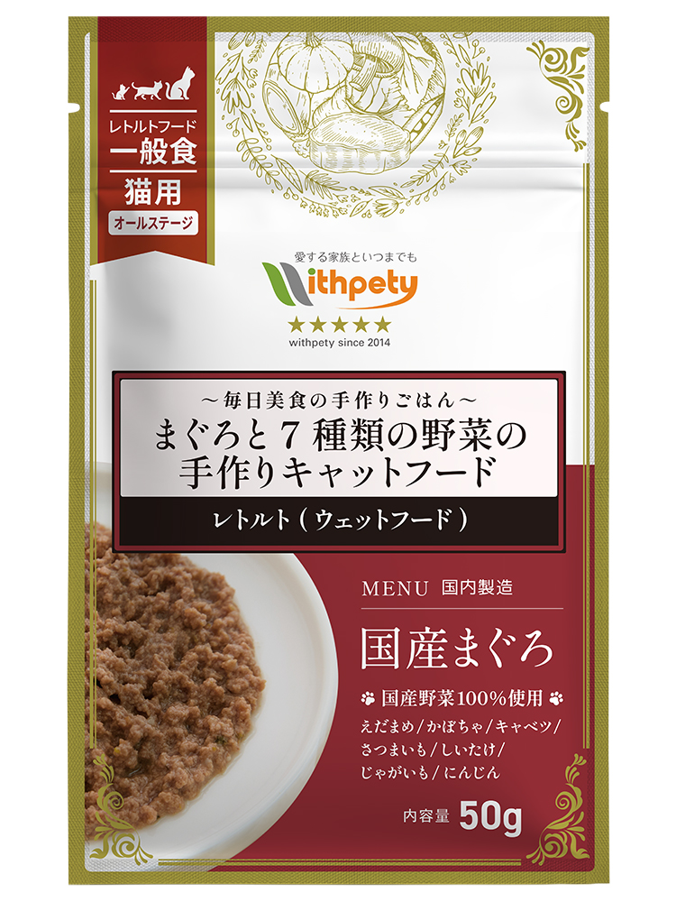 レトルト(ウェットフード) 毎日美食 まぐろと7種類の野菜の手作りキャットフードは、国産まぐろを主原料に、えだまめ、かぼちゃ、キャベツ、さつまいも、しいたけ、じゃがいも、にんじんの7種類の野菜を使用した、手作り仕立てのレトルト(ウェット)キャットフード「毎日美食」。原材料はすべて無添加・国産・ヒューマングレード食材のみを使用し、まぐろと7種類の野菜だけで構成したシンプルな設計です。