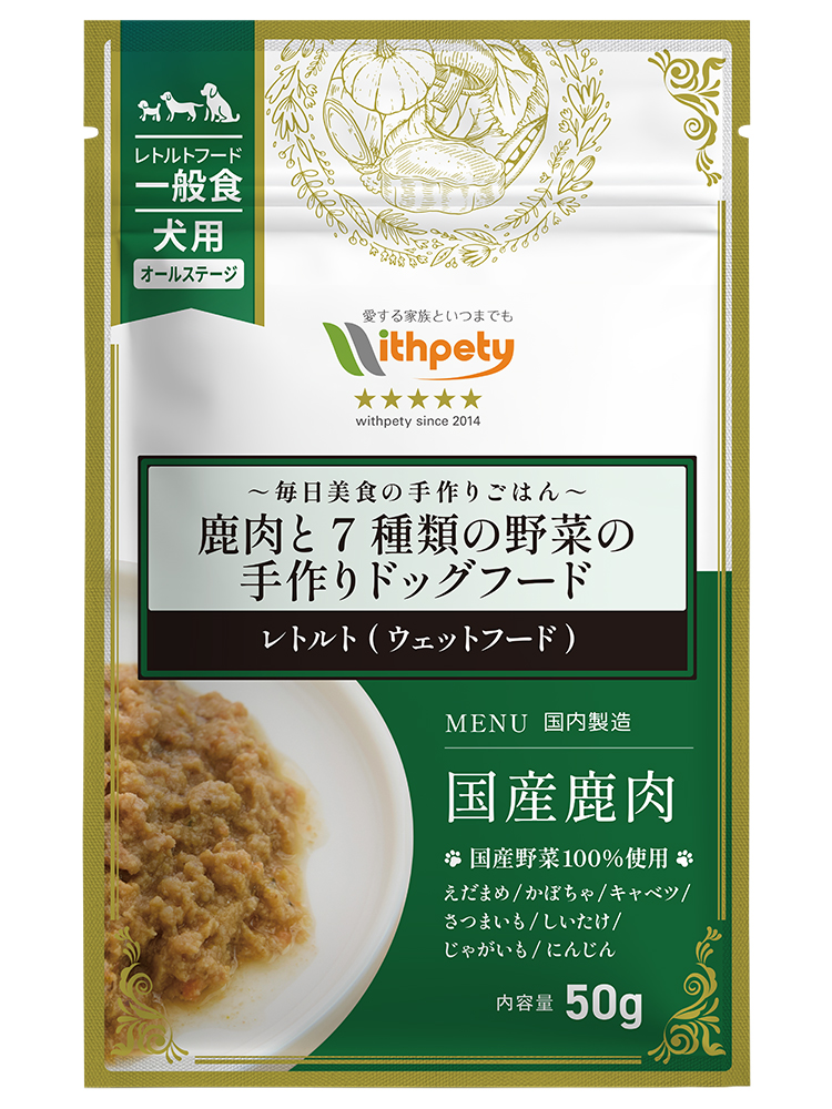 レトルト(ウェットフード) 毎日美食 鹿肉と7種類の野菜の手作りドッグフードは、国産鹿肉を主原料に、えだまめ、かぼちゃ、キャベツ、さつまいも、しいたけ、じゃがいも、にんじんの7種類の野菜を使用した、手作り仕立てのレトルトフードです。原材料はすべて無添加・国産・ヒューマングレード食材のみを使用し、鹿肉と7種類の野菜だけで構成したシンプルな設計です。