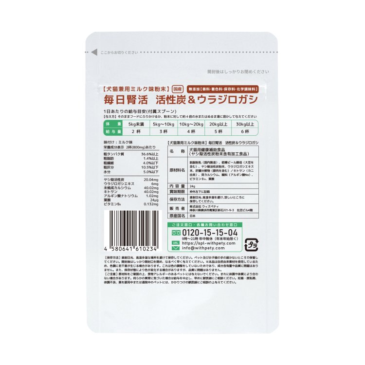 ウィズペティの「犬猫兼用・毎日腎活 活性炭&ウラジロガシ」は犬と猫の腎臓・泌尿器の健康維持に必要な7種類の成分(ヤシ殻活性炭・ウラジロガシ・未焼成カルシウム・キトサン・アルギン酸ナトリウム・葉酸 ビタミンB6)を配合した犬猫兼用粉末サプリメントです。安心安全の国産品質、GMP、ペットフード安全法、残留農薬のポジティブリストに基づき、香料・着色料・保存料・化学調味料を使用せずに製造しています。全犬種・全猫種が食べやすいミルク味粉末タイプです。(ミルク味粉末/1袋24g入り/付属スプーン60杯分)