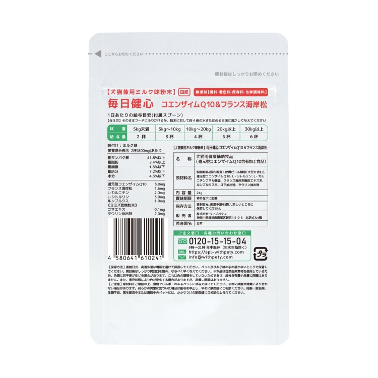 ウィズペティの「犬猫兼用・毎日健心 コエンザイムQ10&フランス海岸松」は犬と猫の心臓の健康維持に必要な7種類の成分(還元型コエンザイムQ10・フランス海岸松・L-シトルリン・L-カルニチン・ルンブルクス末・ゴマエキス・タウリン)を配合した犬猫兼用粉末サプリメントです。安心安全の国産品質、GMP、ペットフード安全法、残留農薬のポジティブリストに基づき、香料・着色料・保存料・化学調味料を使用せずに製造しています。全犬種・全猫種が食べやすいミルク味粉末タイプです。(ミルク味粉末/1袋24g入り/付属スプーン60杯分)