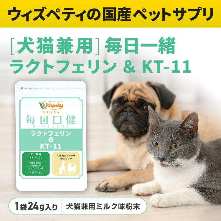 ウィズペティの「犬猫兼用・毎日口健 ラクトフェリン&KT-11」は犬と猫のお口の健康維持のために7種類の成分(ラクトフェリン・KT-11・卵黄粉末〔グロビゲン〕・甜茶抽出物・ポリグルタミン酸・ナタマメ・アスコフィラン)を配合した犬猫兼用粉末サプリメントです。 安心安全の国産品質、GMP、ペットフード安全法、残留農薬のポジティブリストに基づき、香料・着色料・保存料・化学調味料を使用せずに製造しています。全犬種・全猫種が食べやすいミルク味粉末タイプです。(ミルク味粉末/1袋24g入り/付属スプーン60杯分)