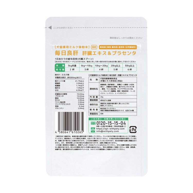 ウィズペティの「犬猫兼用・毎日良肝 肝臓エキス&プラセンタ」は犬と猫の肝臓の健康維持に必要な8種類の成分(肝臓加水分解物・プラセンタ・天然酵母・BCAA・ウコン・マリアアザミエキス・亜鉛・オルニチン)を配合した犬猫兼用粉末サプリメントです。安心安全の国産品質、GMP、ペットフード安全法、残留農薬のポジティブリストに基づき、香料・着色料・保存料・化学調味料を使用せずに製造しています。全犬種・全猫種が食べやすいミルク味粉末タイプです。(ミルク味粉末/1袋24g入り/付属スプーン60杯分)
