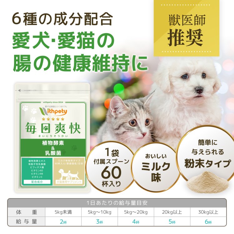 ウィズペティの「犬猫兼用・毎日爽快 植物酵素&乳酸菌」は犬と猫の腸(腸内環境)の健康維持のために6種類の成分(植物発酵エキス〔プロアテーゼ・アミラーゼ・リパーゼ・セルラーゼ・ラクターゼ〕・生きて腸まで届けることにこだわった「乳酸菌(有胞子性乳酸菌)」、さらに「ビフィズス菌」「ビタミンC」「ビタミンB2」「ビタミンB6」を配合しています。安心安全の国産品質、GMP、ペットフード安全法、残留農薬のポジティブリストに基づき、香料・着色料・保存料・化学調味料を使用せずに製造しています。全犬種・全猫種が食べやすいミルク味粉末タイプです。(ミルク味粉末/1袋24g入り/付属スプーン60杯分)