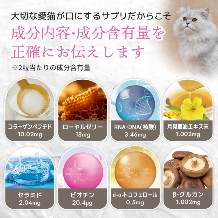 | 商品名 | 猫用・毎日美肌 コラーゲンペプチド&ローヤルゼリー |