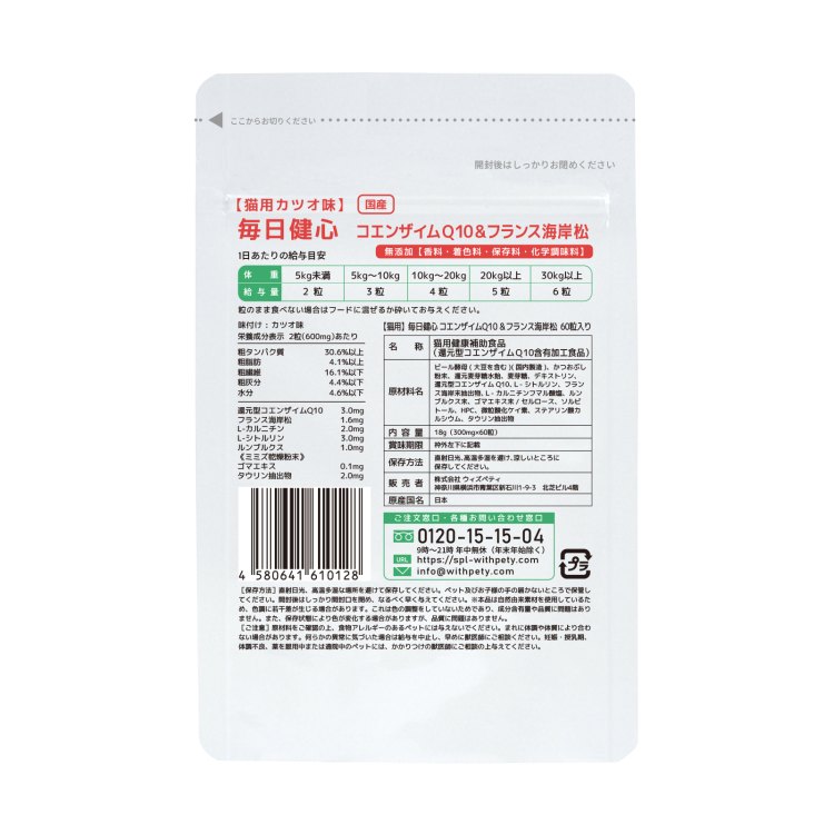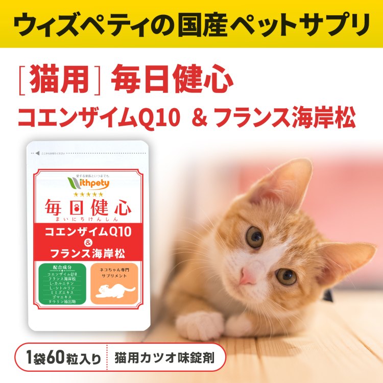 ウィズペティの「猫用・毎日健心 コエンザイムQ10&フランス海岸松」は心臓の健康維持に必要な7種類の成分(還元型コエンザイムQ10・フランス海岸松・L-シトルリン・L-カルニチン・ルンブルクス末・ゴマエキス・タウリン)を配合しています。安心安全の国産品質、GMP、ペットフード安全法、残留農薬のポジティブリストに基づき、香料・着色料・保存料・化学調味料を使用せずに製造しています。全猫種が食べやすい錠剤タイプです。(直径10mmのカツオ味錠剤/1袋60粒入り)