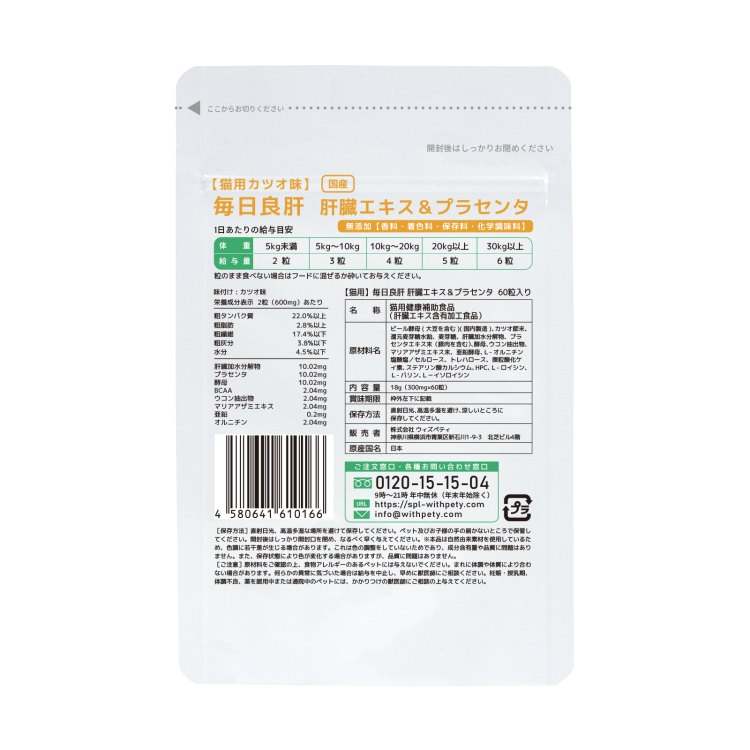 ウィズペティの「猫用・毎日良肝 肝臓エキス&プラセンタ」は肝臓の健康維持に必要な8種類の成分(肝臓加水分解物・プラセンタ・天然酵母・BCAA・ウコン・マリアアザミエキス・亜鉛・オルニチン)を配合しています。安心安全の国産品質、GMP、ペットフード安全法、残留農薬のポジティブリストに基づき、香料・着色料・保存料・化学調味料を使用せずに製造しています。全猫種が食べやすい錠剤タイプです。(直径10mmのカツオ味錠剤/1袋60粒入り)