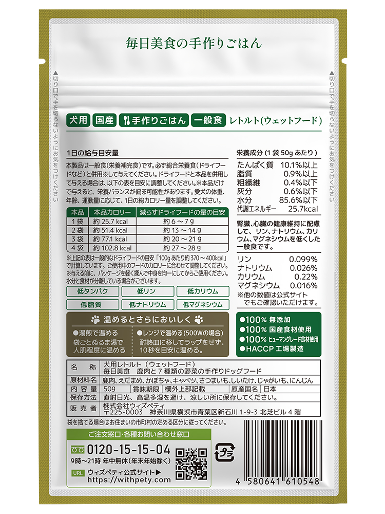 レトルト(ウェットフード) 毎日美食 鹿肉と7種類の野菜の手作りドッグフードは、国産鹿肉を主原料に、えだまめ、かぼちゃ、キャベツ、さつまいも、しいたけ、じゃがいも、にんじんの7種類の野菜を使用した、手作り仕立てのレトルトフードです。原材料はすべて無添加・国産・ヒューマングレード食材のみを使用し、鹿肉と7種類の野菜だけで構成したシンプルな設計です。