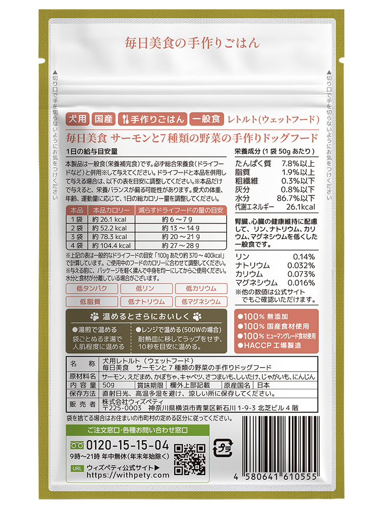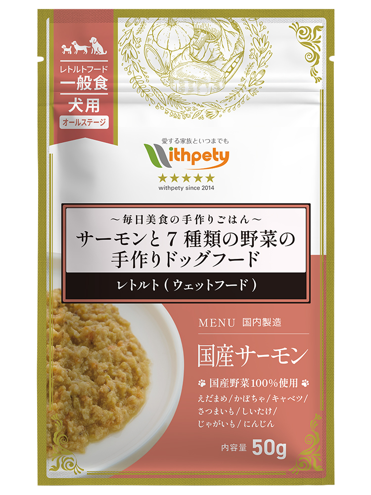 レトルト(ウェットフード) 毎日美食 サーモンと7種類の野菜の手作りドッグフードは、国産サーモンを主原料に、えだまめ、かぼちゃ、キャベツ、さつまいも、しいたけ、じゃがいも、にんじんの7種類の野菜を使用した、手作り仕立てのレトルトフードです。原材料はすべて無添加・国産・ヒューマングレード食材のみを使用し、サーモンと7種類の野菜だけで構成したシンプルな設計です。